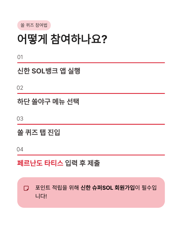 이렇게 야구 상식도 쌓으면서 마이신한포인트를 챙길 수 있는 쏠 퀴즈는 정말 매력적이에요. 정답을 맞히면 랜덤으로 2포인트에서 최대 100포인트까지 즉시 적립되는데, 더블 이벤트가 있는 날에는 최대 200포인트까지 받을 수 있답니다. 참여 방법은 신한 SOL뱅크 앱 하단의 쏠야구 메뉴에서 쏠 퀴즈를 선택하시면 돼요. 오늘 정답인 페르난도 타티스를 입력하시고 제출하기 버튼을 누르는 거 잊지 마세요! 포인트 적립을 위해서는 신한 슈퍼SOL 회원가입이 미리 되어 있어야 하니, 아직 안 하신 분들은 이번 기회에 가입해 두시면 앞으로의 앱테크 생활이 훨씬 편해질 거예요.
