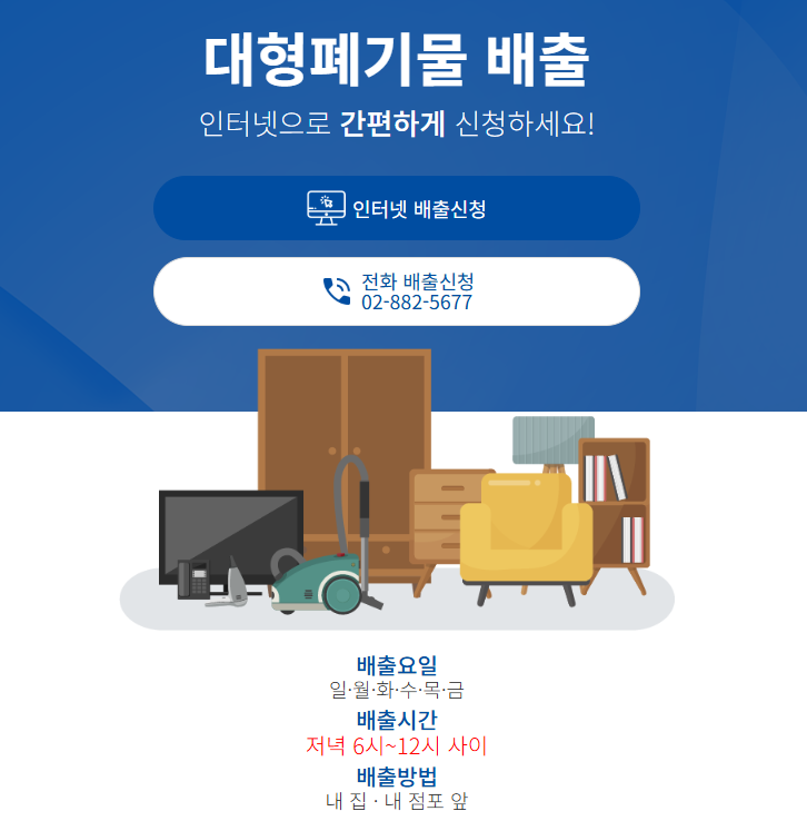 - 절차: 거주지 구청 홈페이지 접속 → 대형폐기물 신고 메뉴 선택 → 품목 및 배출일 지정 → 수수료 결제 → 신고필증 출력 후 부착