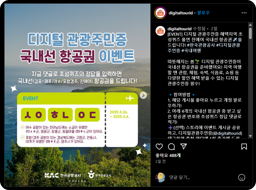 ➕(선택) 스토리에 이벤트 게시글 공유하고, 디지털관광주민증(@digitaltourid) 태그하면 추첨 명단에 1회 추가해 드려요!