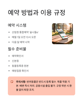 - 예약처: 산림청 통합예약 시스템 ‘숲나들e’