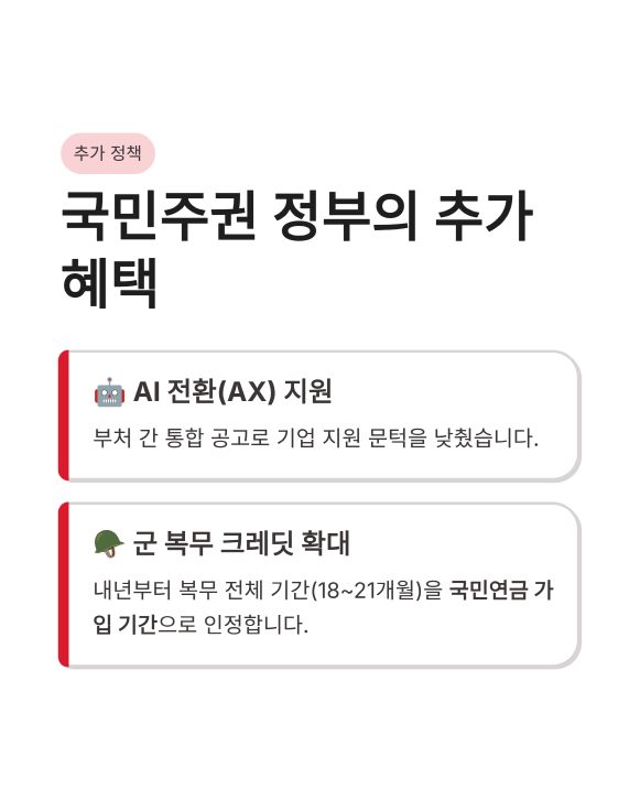 - 추가 혜택: 내년부터 군 복무 전체 기간 국민연금 크레딧 인정