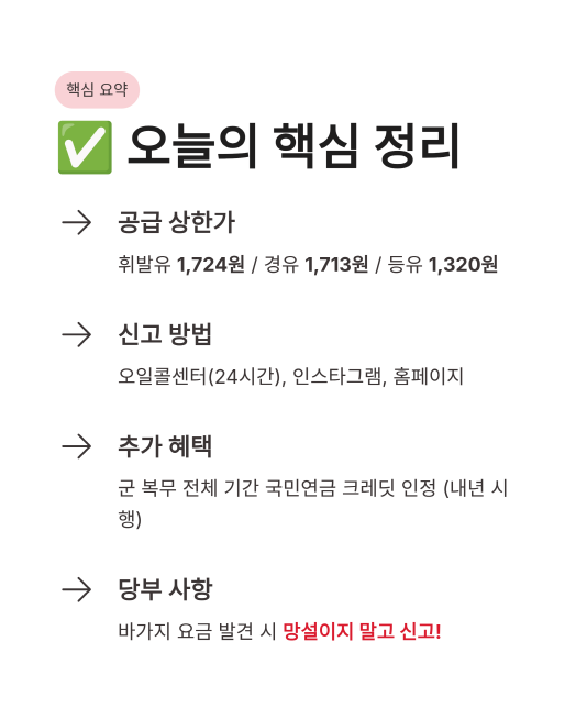 - 공급 상한가: 휘발유 1,724원 / 경유 1,713원 / 등유 1,320원