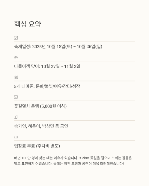 축제의 백미는 황룡강을 따라 조성된 10km의 꽃길 산책코스입니다. 특히 석양이 지는 오후 5-6시경 황금빛 코스모스밭이 장관을 이루며, 야간에는 LED 조명으로 환상적인 야경을 연출합니다.주말에는 전통공연과 버스킹 공연이 펼쳐지고, 지역 특산품 장터에서 황룡강 쌀과 한과 등을 저렴하게 구매할 수 있어 일석이조입니다.
