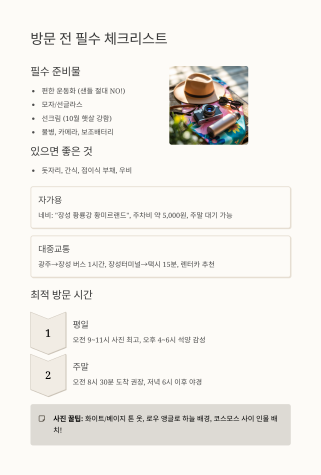 가을 날씨 변화가 심하므로 얇은 외투와 편한 운동화는 필수입니다. 꽃밭에서의 완벽한 인생샷을 위해 휴대용 삼각대와 보조배터리를 준비하고, 벌레가 많으니 방충제도 챙기세요.