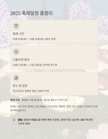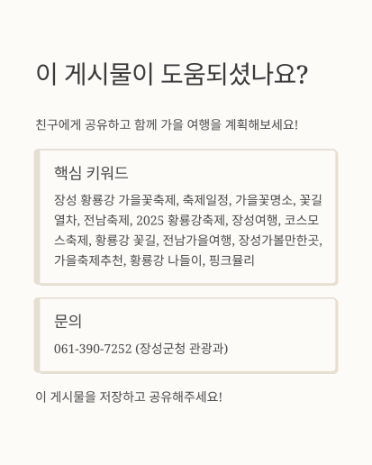 매년 30만 명이 찾는 장성 황룡강 가을꽃축제, 올해는 더욱 화려해졌습니다! 코스모스와 메밀꽃이 만드는 환상적인 풍경을 놓치면 1년을 기다려야 하는데, 축제 기간과 최적 관람 시기를 모르면 헛걸음할 수 있습니다. 지금 바로 완벽한 관람 가이드로 가을의 절정을 만나보세요.