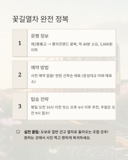 축제장은 장성군 황룡면 아치실마을 일대에서 열리며, 네비게이션에 '황룡강 꽃단지' 또는 '아치실마을'을 검색하면 됩니다. 서울에서 자차로 약 3시간 30분, KTX 광주송정역에서 버스로 1시간 소요되며, 축제 기간 중에는 광주송정역과 장성역에서 셔틀버스가 30분 간격으로 운행됩니다.