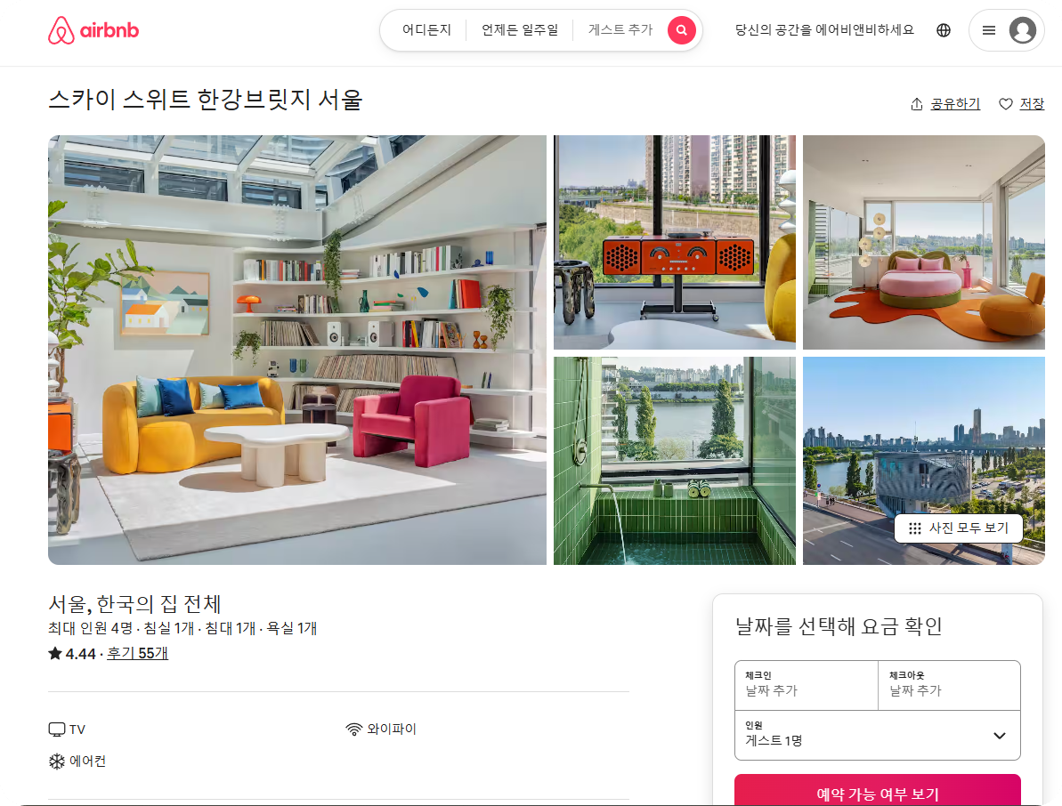 스카이 스위트의 예약은 에어비앤비 플랫폼(airbnb.co.kr/skysuite)을 통해 이루어집니다.