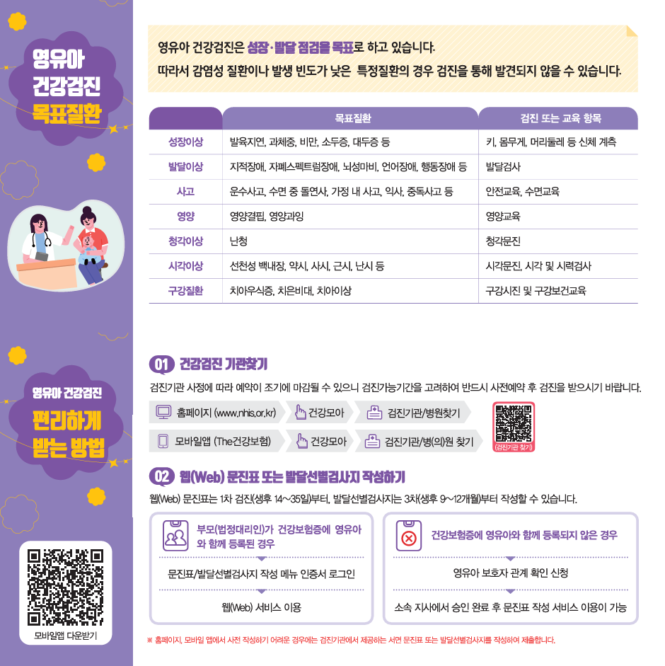 영유아 건강검진을 받으려면 건강검진표가 필요합니다. 이 검진표는 국민건강보험공단에서 발급하며, 온라인 및 오프라인 모두에서 쉽게 받을 수 있습니다. 검진 예약은 건강보험공단 홈페이지, The건강보험 앱, 또는 검진기관에 직접 전화하여 예약할 수 있습니다.