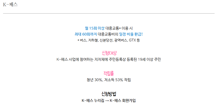 전국의 만 19세 이상 주민을 대상으로 한 달에 15회 이상 대중교통을 이용하면 최대 60회까지 교통비의 일부를 적립해 주는 제도입니다. 특히, 만 19세부터 34세까지의 청년은 이용 금액의 30%를 적립받을 수 있습니다.