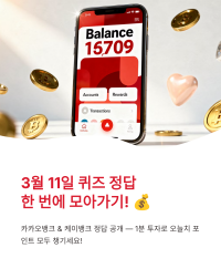 오늘도 돌아온 3월 11일자 금융권 퀴즈 정답입니다! 카카오뱅크와 케이뱅크에서 쏟아지는 포인트 혜택, 단 1분 투자로 모두 챙겨가실 준비 되셨나요?
