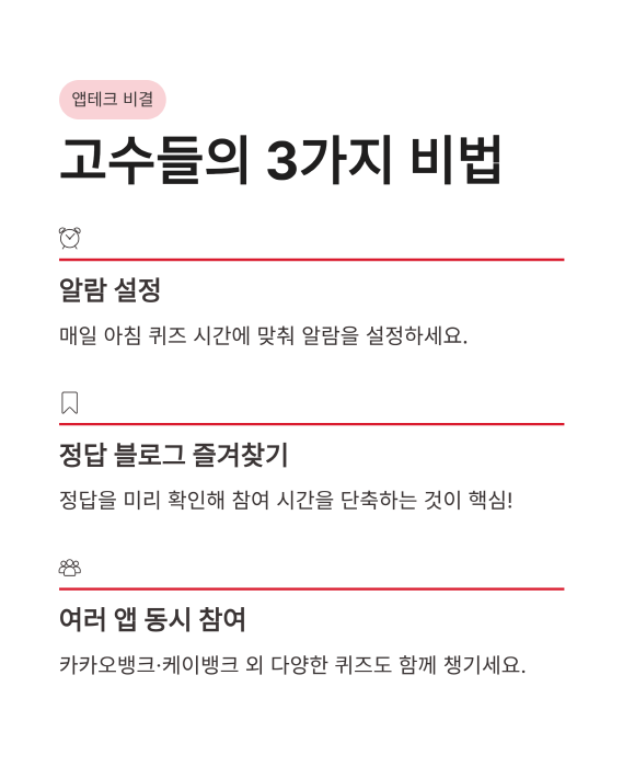 오늘 3월 11일 카카오뱅크와 케이뱅크 퀴즈 정답을 모두 확인하셨다면 이제는 지속 가능한 앱테크를 위한 꿀팁을 전해드릴까 해요. 퀴즈 정답을 맞히는 것도 중요하지만, 가장 중요한 건 매일 '잊지 않고' 참여하는 습관입니다. 저 같은 경우는 알람을 맞춰두거나 블로그를 즐겨찾기 해서 아침 루틴으로 만들었더니 훨씬 편하더라고요.